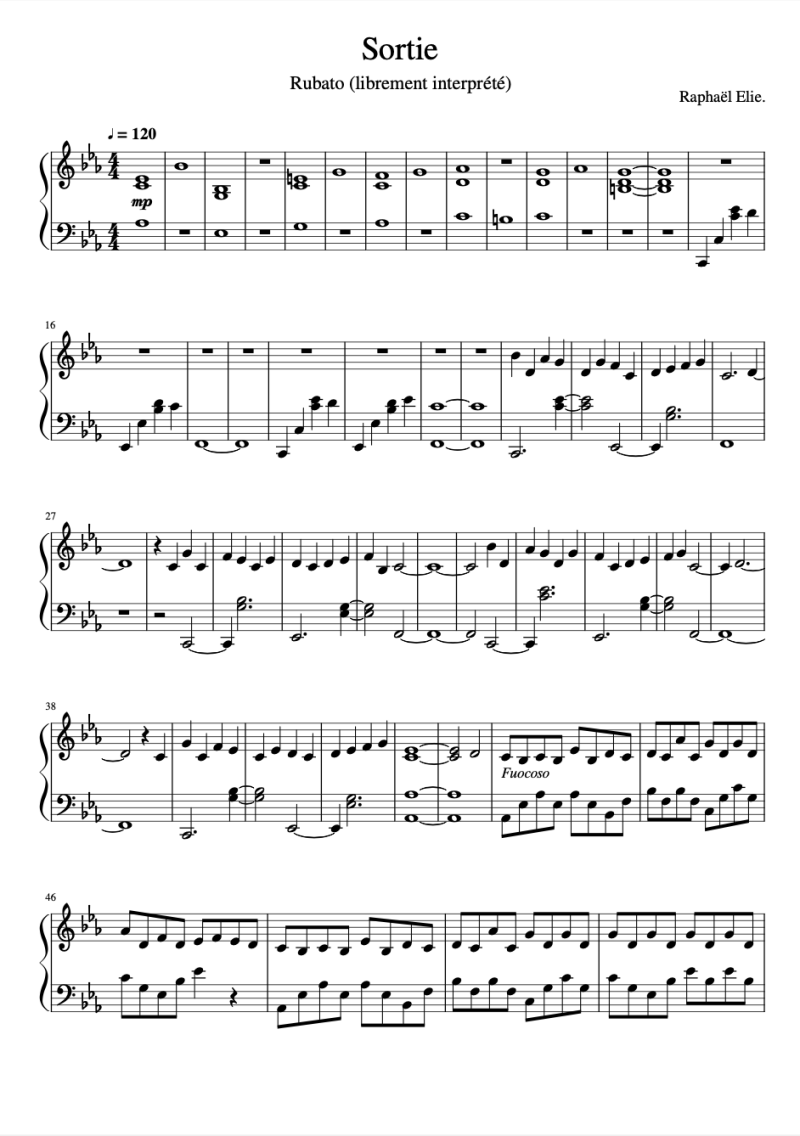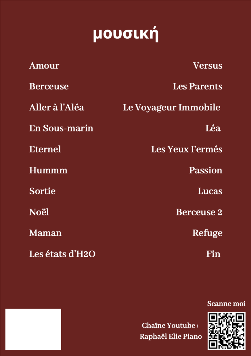 Le récital μουσική, traduit de musique en grec, est un récital de piano composé de 20 pièces réalisées entre 2019 et 2021. Ces 20 pièces durent en moyenne entre 2 et 5 minutes. Elles sont composées de nombreuses gammes différentes et abordent des techniques pianistiques comme la polyphonie, le contrepoint, le travail harmonique et mélodique. Ces techniques servent à l'apprentissage de mes élèves comme avec la "Berceuse" qui est le premier morceau abordé par les enfants de mes cours. Cette réalisation est passée par plusieurs étapes. J'ai commencé à composer de petits morceaux instrumentaux sans développer leur potentiel. Ces premiers morceaux inachevés ont pour la plupart été terminés près de deux ans après leurs ébauches. Ils sont le fruit de longues hésitations et de longues recherches. Car si j'ai appris quelques choses en composant cette première réalisation pianistique, c'est bien que lors de la composition, tous les choix sont possibles, des milliers de chemins s'offrent à nous et nous sommes pourtant contraints de faire un choix car lorsque l'ont créé, que l'on fait, on détruit ce qui aurait pu être. Je suis donc passé d'une composition par laquelle je recherchais encore et encore la meilleure version de mon morceau, à force de variations toujours plus nombreuses, à une composition bien plus instinctive et naturelle. Ma manière la plus récente de composer est de me laisser porter par la musique. Lorsque j'ai une mélodie dans la tête je la joue, si je n'en ai pas de suite, je ne me force pas, et le morceau vient naturellement, par passages et de façon logique. Et le résultat donne finalement un résultat plus naturel qui exprime un sentiment plus brut et direct. Une émotion exprimée à travers le piano.